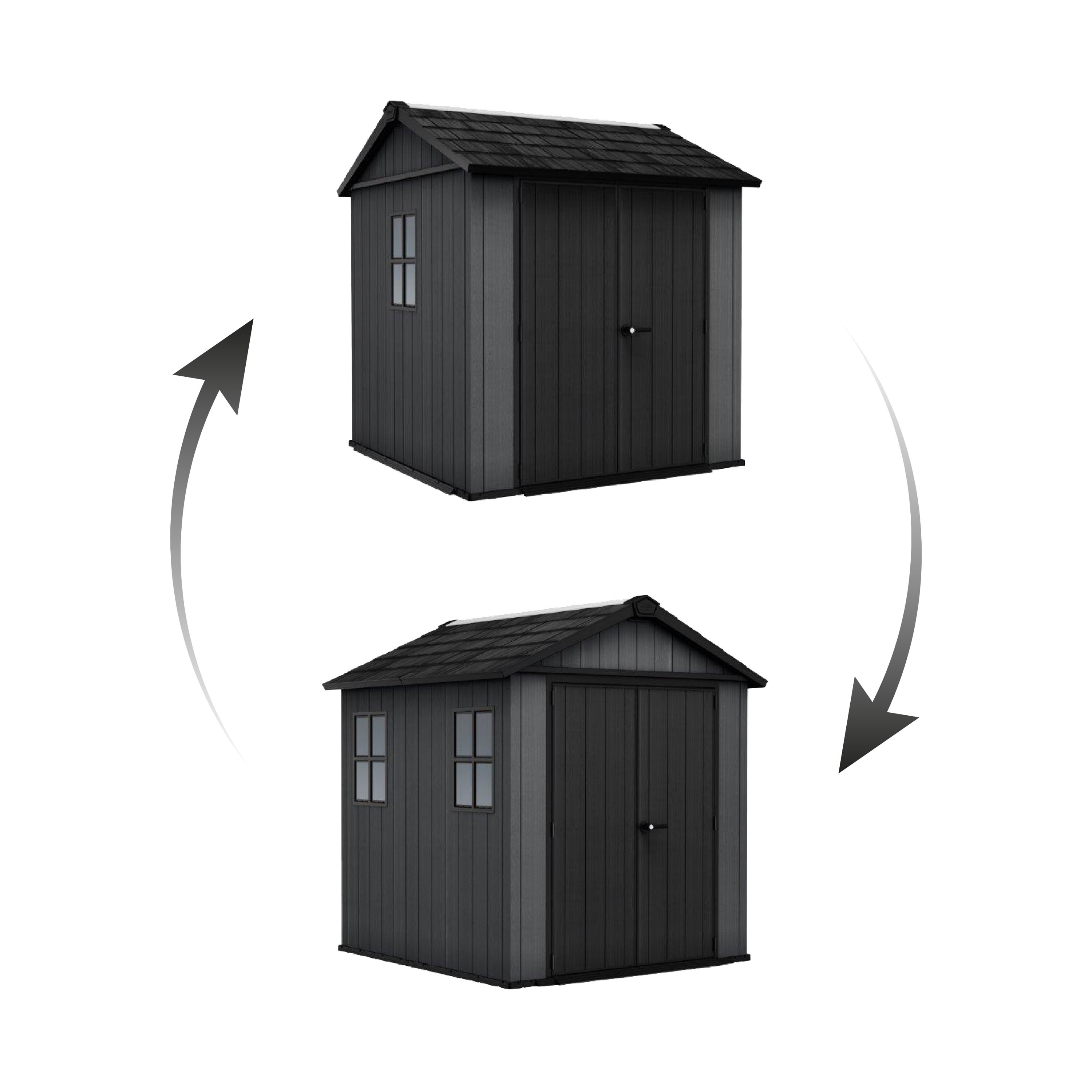 : KeterZáhradný domček na skladovanie záhradného, ??dielenského náčinia a ďalšieho vybavenia, 2 možnosti zostavenia, 2,3 x 2,46 x 2,24 m, sedlová strecha a podlahový panel pre zaťaženie až 150 kg/m2, dvojité steny, okienka. Materiál Evotech. Tmavosivá farba.