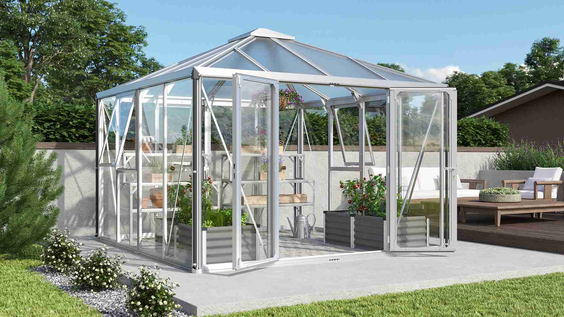 Skleník FORTUNA je zaradený do kategórie PREMIUM - skleník je vyrobený značkovým výrobcom z Veľkej Británie. Skleník je vyrobený z eloxovaných hliníkových profilov, presklenie je z kaleného skla hrúbky 3 mm. Sklo výrazne znižuje prehrievanie priestoru vo vnútri počas letných mesiacov a súčasne zaisťuje dostatočnú svetelnú priepustnosť. Kalená verzia skla zaisťuje jeho úplnú bezpečnosť - v prípade rozbitia sa sklenená výplň roztriešti na tisíce malých kúskov, čo zabráni prípadnému vážnemu zraneniu. To je veľmi dôležitá vlastnosť skleníka, ktorú ocenia predovšetkým rodičia malých detí pobehujúcich po záhrade. Presklenie strechy je z tepelnoizolačných komôrkových polykarbonátových dosiek s hrúbkou 10 mm. Dvojité rámové profily obopínajú veľké tabule skla/polykarbonátu po stranách bez rušivých kotviacich pomôcok, ako sú zasklievacie spony.