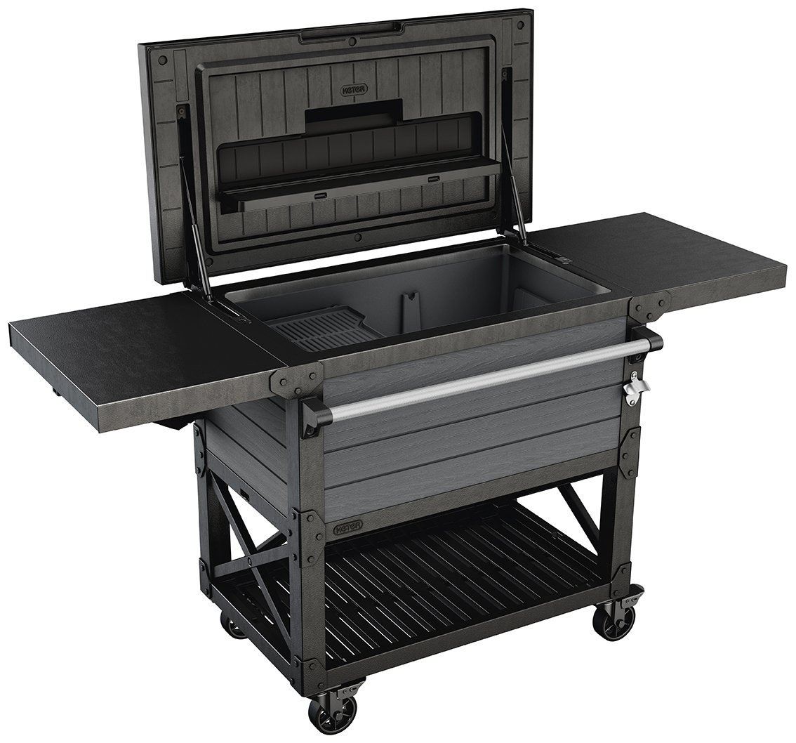 : KeterRozkladací stôl, odolnosť voči poveternostným vplyvom a UV žiareniu, veľké množstvo políc, úložný priestor s oddeliteľnou prepážkou, možnosť chladenia nápojov, kolieska na jednoduchú manipuláciu, povrch s imitáciou dreva.