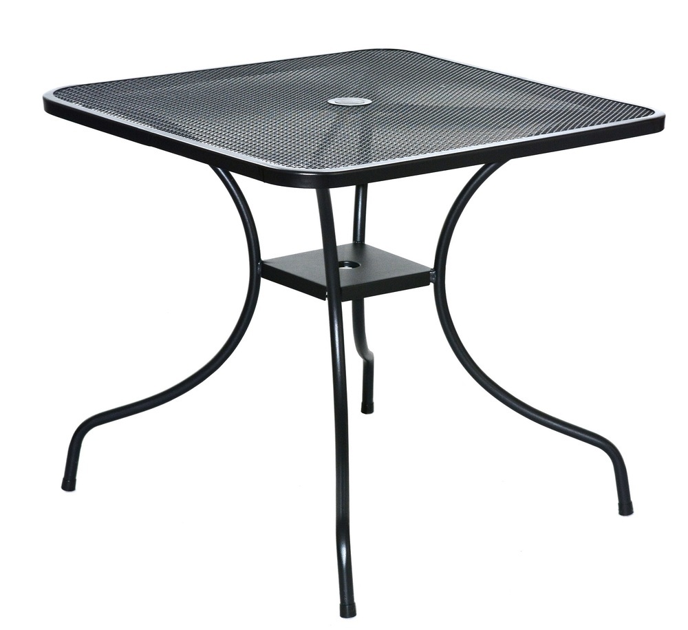 Kovový záhradný stôl s drôtenou doskou štvorcového tvaru. Dobre sa kombinuje so všetkými typmi kovového záhradného nábytku.