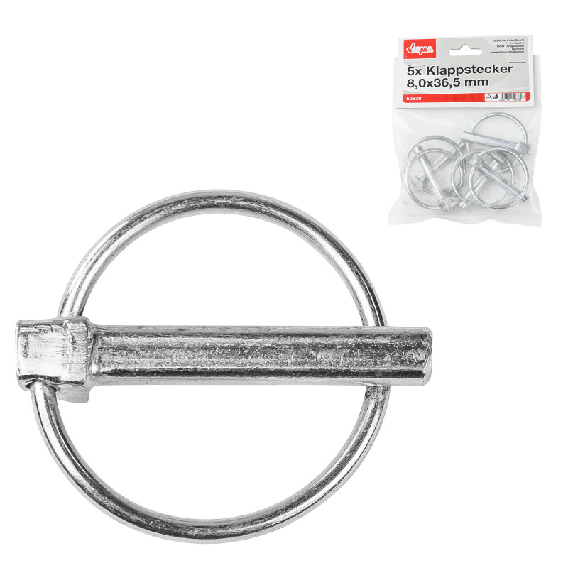 : DEMAZaisťovací kolík s krúžkom na hriadeľové spojenia a zaistenie pohonov v poľnohospodárstve a lesníctve, strojárstve, pri výrobe náradia, zaistení kolies u lištových kosačiek a podobne. Celokovový, pozinkovaný. V balení 5 ks.