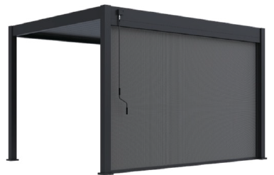 : RojaplastPre maximálne využitie bioklimatických pergol ponúkame aj príslušenstvo v podobe zásteny s hliníkovou konštrukciou a textilnou výplňou, ktorá poskytuje ochranu pred vetrom a zároveň vytvára príjemný tieň. Pevná a stabilná konštrukcia v antracitovej farbe RAL 7016, matný povrch.