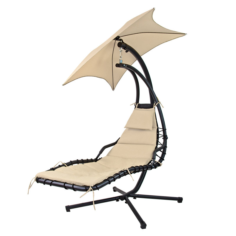 : DEMAZávesné relaxačné kreslo s pevným kovovým podstavcom s povrchovou úpravou práškovaním. Jednoduchá montáž, extra široká plocha na ležanie, nastaviteľná tieniaca strieška z vodoodpudivého polyesteru, odnímateľný matrac z polyesteru. Dodáva sa v demonte.