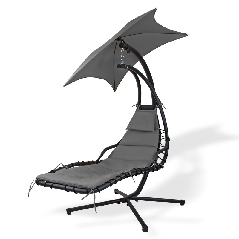 : DEMAZávesné relaxačné kreslo s pevným kovovým podstavcom s povrchovou úpravou práškovaním. Jednoduchá montáž, extra široká plocha na ležanie, nastaviteľná tieniaca strieška z nepremokavého polyesteru, odnímateľný matrac z polyesteru. Dodáva sa v demonte.